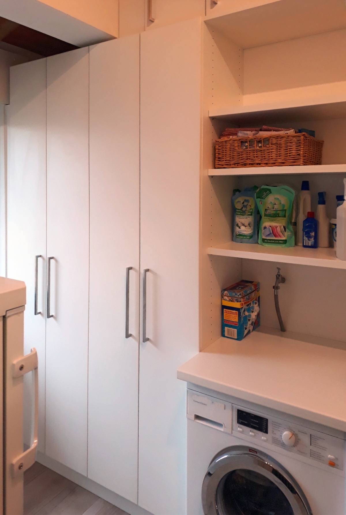 Limitiert von Dachschräge und Balken sollte der Raum im Hauswirtschaftsraum maximiert werden. So fertigten wir um die bestehenden Anschlüsse für Waschmaschine und Trockner funktionale Schränke in pflegeleichter matt-weißer Lackierung mit Griffen aus Edelstahl.