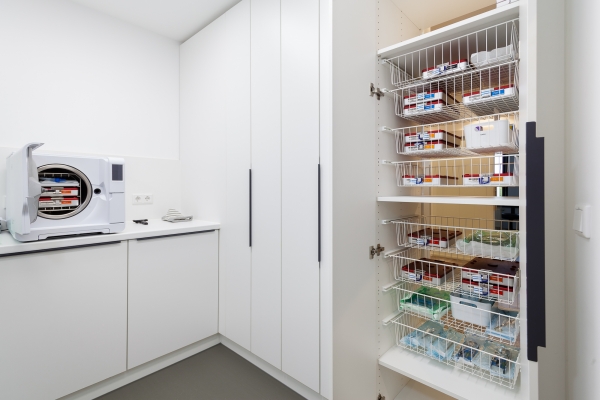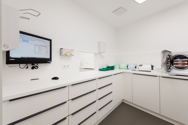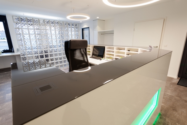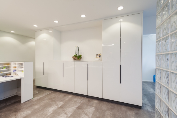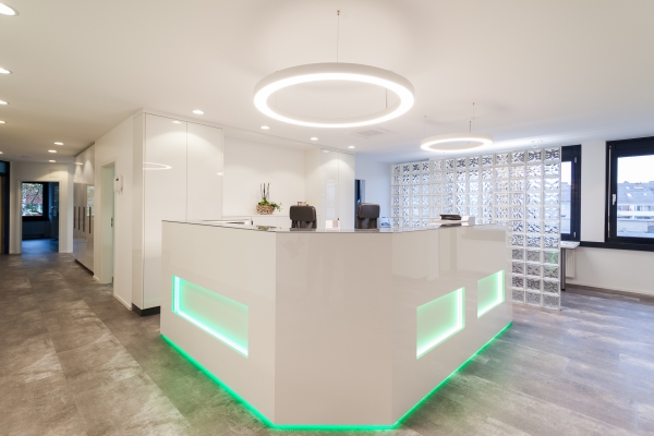 In Köln konnten wir unser gesamtes know-how für einen Komplettausbau einer Praxis einsetzen. Von der großzügigen Empfangstheke mit Sortier- und Ablagefächern, angeschlossener Garderobe über Behandlungsräume mit Schreibtischen und Spenderschränken bis hin zum beidseitig benutzbaren Sterilbereich lieferten wir dem Kunden praktische Lösungen im ansprechenden Design.